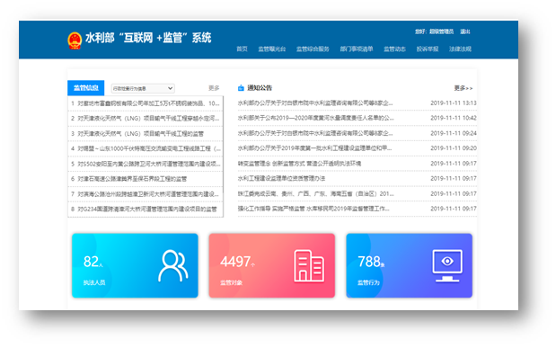 ? ? ???“?互聯網+監督?”?工作門戶依托水利部在線政務服務平臺,在充分利用近年來水利信息化建設成果和信息化資源基礎上,統一監管事項的代碼、名稱、流程等,統一數據歸集標準,提高水利監管規范化、精準化、智能化水平,逐步實現監管事項數據可共享、可分析,風險可預警,為加強和創新水利部“雙隨機、一公開”監管、信用監管、重點監管和聯合監管,提供強有力的技術支撐,逐步實現對水利監管對象的全覆蓋、監管過程的全記錄,并實現與國家“互聯網+監管”系統的對接。